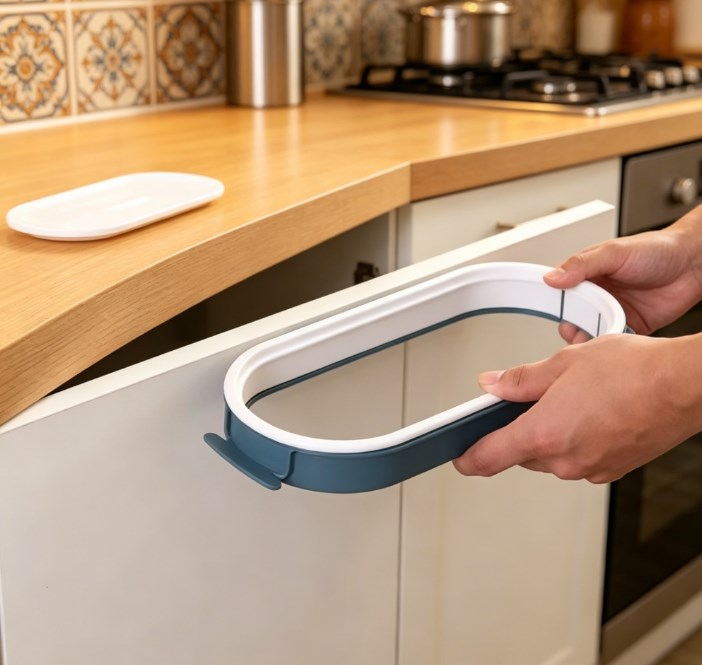 Say goodbye to bulky floor bins and messy countertops! Our Hanging Trash Bag Holder is the ultimate life-hack for your kitchen. By utilizing your existing plastic grocery bags, this rack creates an instant, accessible waste bin right where you need it most. Perfect for food prep, it hangs securely on your cabinet door, allowing you to sweep scraps directly off the counter and into the bag.